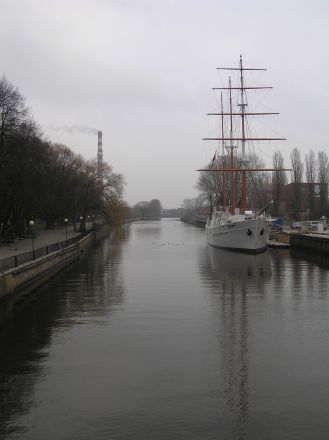 Vi står på bron över Danė som utgör en del av Tiltų-gatan. Här ser vi det berömda ”Meridianas”-skeppet, där det ligger förtöjt strax öster om bron. Åt andra hållet, nära Danės mynning i haffet, anlade Tyska orden på 1200-talet en borg som gavs namnet Memel. Därigenom kunde man kontrollera sjöfarten från Östersjön in i Kurisches Haff och vidare uppför Litauens vattenvägar (till exempel Nemunas), men också den viktiga överfarten från Kuriska näsets spets till det litauiska fastlandet. Memel kom att utvecklas till en blomstrande hamnstad. Byggandet av borgen i Memel var alltså en del av den kolonisation av Östersjö-området mellan floderna Nemunas och Wisła som Tyska orden inledde på 1200-talet. Den västra delen av området tvingades man dock avträda 1466. Den kvarvarande östra delen bildade år 1525 hertigdömet Preussen, i vilket Memel kom att ingå. Beteckningen "Ostpreussen" började användas efter Polens första delning 1772 när Preussen erhöll områden vid floden Wisłas mynning (Västpreussen). Mellan åren 1629 och 1635 lydde Memel under Sverige.