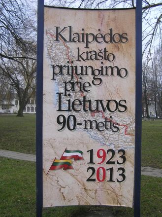 Affisch som påminner om att det gått 90 år sedan Litauen lade beslag på Memelområdet (litauiska: Klaipėdos krašto). Den grön-vit-röda flaggan är "Lill-Litauens" (litauiska: Mažoji Lietuva) flagga.