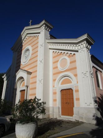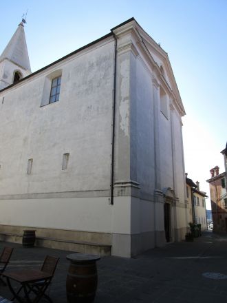 Sankt Mauritius kyrka – Cerkev sv. Mavra – Chiesa di S. Mauro. Den ursprungliga kyrkan byggdes på 1300-talet, den nuvarande 1547 men den har byggts om flera gånger sedan dess.