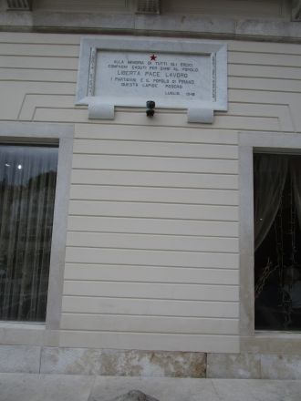 På en husvägg finns en minnestavla med följande text på italienska: "Till minne av alla hjältemodiga kamrater som stupade för att ge folket FRIHET FRED ARBETE /Partisanerna och Pirans invånare satte upp denna minnestavla /juli 1948". På tavlans vänstra kant står "Evig ära" och på den högra "Folkets hjältar".