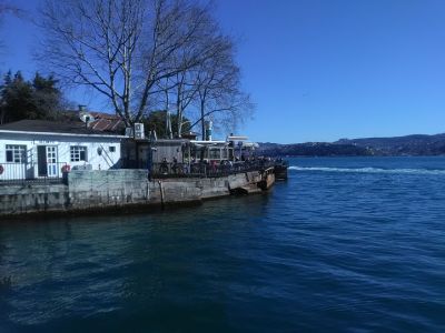 Båtstationen i Istinye - ett vitt trähus med blå inslag - var bedårande. Strax intill en enkel servering. De stora trädkronorna var ännu vintrigt nakna.