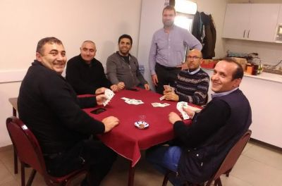 Jag blev fotograferad tillsammans med männen där de satt och spelade kort, och tog också ett foto på bordet intill där det tidigare spelats rummikub; brickor och brickställ låg huller om buller.