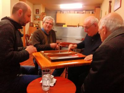 På mitt kafeneion i Florina. Tavli-spelaren till vänster är syskonbarn till den äldre spelaren och den som driver kaféet.